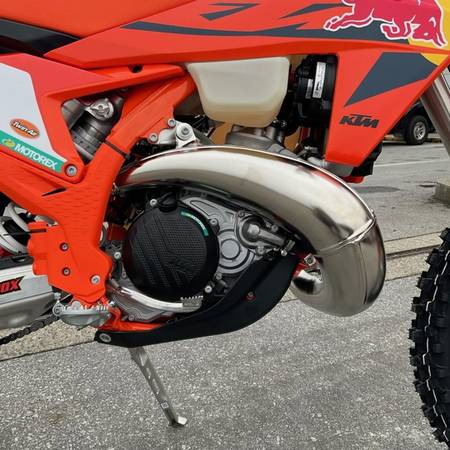Specifically engineered for longitudinal rigidity, the KTM 300 XC-W CHAMPION EDITION is engineered around a gloss-orange powder-coated frame providing exceptional rider feedback, energy absorption, and high-speed stability. This is achieved by repositioning the rotating masses in the frame along with a forged steering head connection. The footrest mounts also feature a slim design for less risk of hooking up. And when the ride comes to an end, a forged one-piece side stand ensures your enduro weapon stands proud.