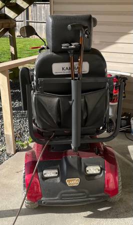 Karma KS-838 mobility scooter key features include deluxe swivel seat, full lighting system (headlamp, tail lights, indicators), drum front brake, 1200W motor, top speed of 15 km/hr, range up to 60 km, hydraulic suspension for a smoother ride. Also comes with accessories: cover to protect user in weather conditions, storage cover, battery charger. Scooter was not used a lot and serviced/maintained on a regular basis.