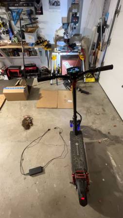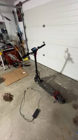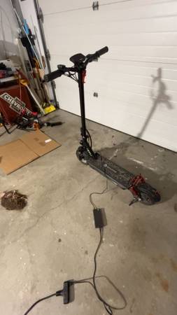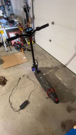 Scooter can go 45 km on a charge and max speed is 45 kph or 50 downhill. Scooter comes with charger. Scooter has dual rear shocks off-road tires a horn led lights and a spotlight
