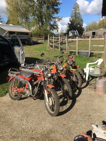 In this lot is a true "Barn Find" I am selling for a friend. 4 bikes basically complete with extra parts Late 1970's CT90 CC Honda motorbikes. All 4 for $2,600. Great for a family that want to use these for off road or at the cabin!