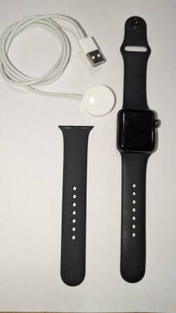 Apple Watch Series 3 38mm Aluminum Case GPS Comes with 2 strap lengths and charger. Good condition, no scratches.