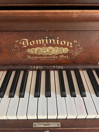 Old solid wood antique Dominion piano with ivory keys. Middle pedal needs fixing. One key not working. Cash only. No delivery. Buyer to pick up and transfer