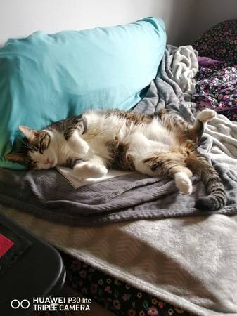 Georgie needs a quiet home. We've experienced changes in our shared housing; something that was working, is now not. Georgie is an awesome, 9 year old, 12 pound, neutered housecat. Georgie is a shy cat. He's also a lover not a fighter. He'd never catch a mouse or a bug, but he will cheer you on as you do. When Georgie gets used to you, he'll love it if you talk to him, he'll talk back to you. Comes with cat post. Token rehoming fee.