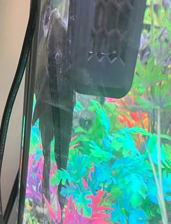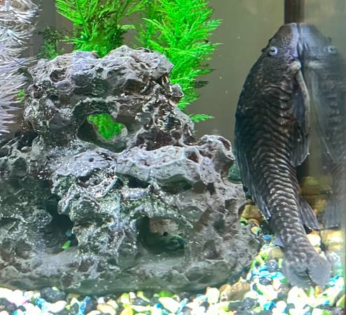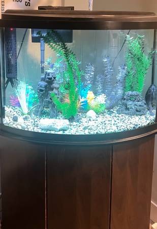 The bowed front tank is a 60 gallon with all the accessories and everything you see there and it’s a freshwater tank. Can include the 2 plecos for a rehoming fee.