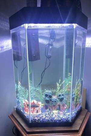 The octagon tank is a 30 gallon and it includes everything in the picture as well as the large rainbow charge for a rehoming fee. I have to move in a month and I’m sad I have to sell them. Iv had them for almost 5 years.