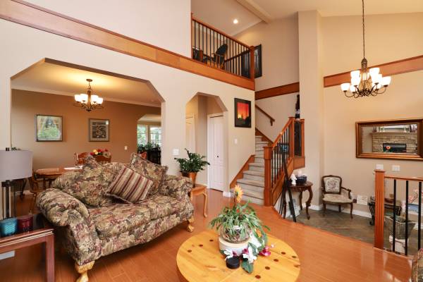 Beautiful family home with income potential in a desirable family friendly neighbourhood. The main level features a grand entrance with a 20' vaulted ceiling. Bright/functional layout greeting families and guests. Open to a formal dining area then to the heart of the home, the great room with gourmet kitchen. Granite countertops/ nook with a large living room. The back deck backs onto a large green belt with a creek. Whether you're dreaming of a play area for kids, haven for pets, or a garden oasis. This blank canvas offers endless potential you can imagine. The upper level boasts a large French door entry to the primary bedroom with a separate shower, jetted tub and walk-in closet. Additional 3 good sized bedrooms for the kids. Unauthorized contained suite in the lower level.