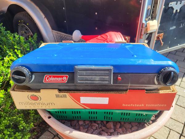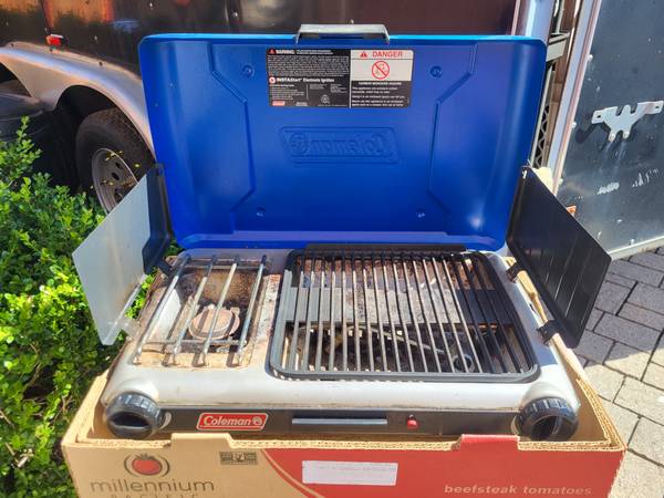 Good working condition Coleman camp stove Grill on one side and a burner on the other