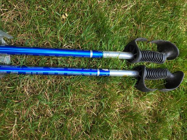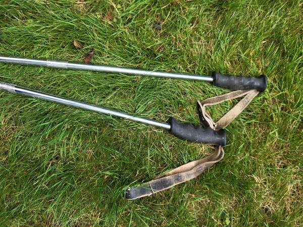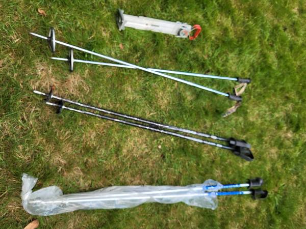 One set of new ski poles for $20, bottom of photo, never used, 54" tip to tip. One set of used ski poles for $15, middle of photo, 49" tip to tip. One older set of ski poles for $10, top of photo, 48" tip to tip