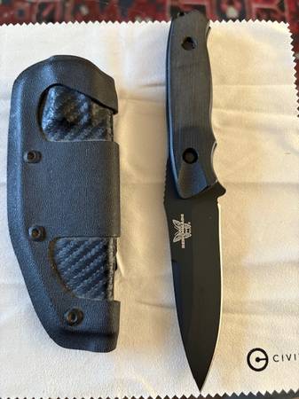 Vintage Collectable Benchmade Nimravus Cub, serial numbered first production run, black G10 handle with balck ATS 34 blade. Some disclororation in the handle scales, and a few scuffs, but otherwise in excellent condition. Comes with original Kydex sheath. $275