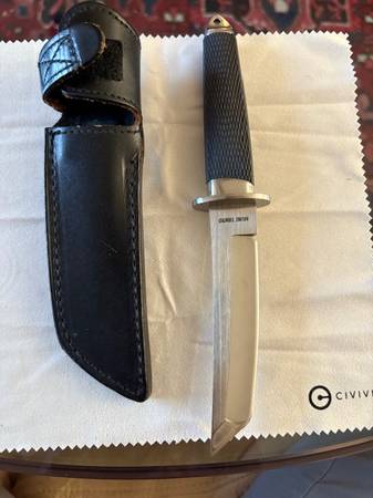 Vintage Cold Steel Mini Tanto, made in Japan, checkered Kraton handle Aus 8 balde steel and butt cap, comes with original leather sheath, $150. Sold