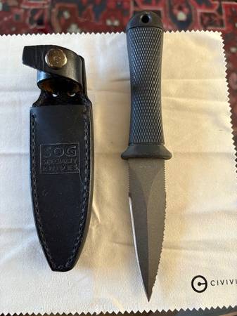 S.O.G. Mini Pentagon, checkered Kraton handle, 3.5" Aus 6 double edged, serrated/plain edge beadblasted blade, never used, never carried, in new condition, comes with original leather sheath, (Sold)