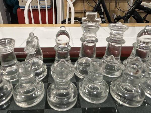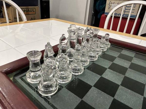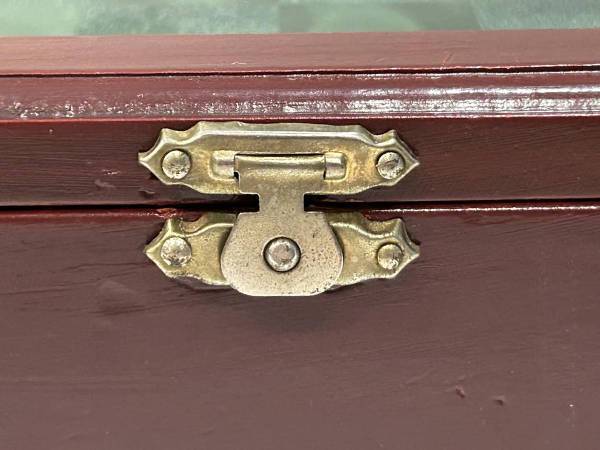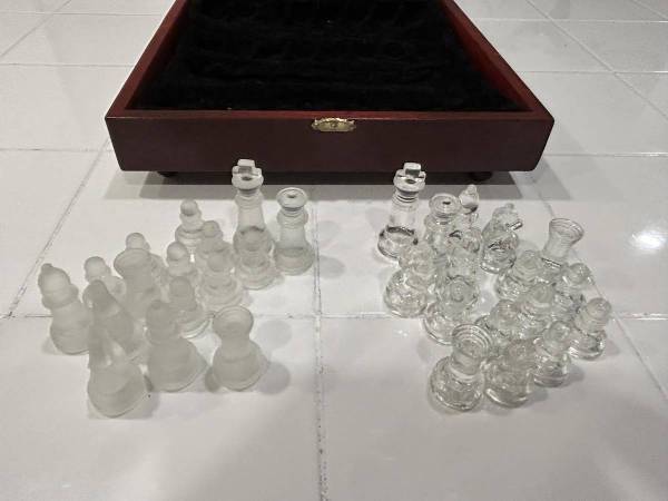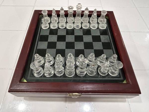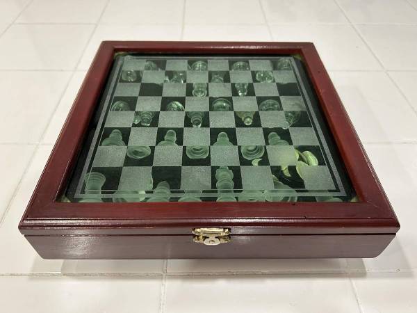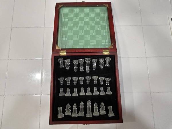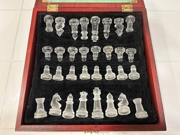 This one is very unique in that the chess set is contained within a lidded hinged casing with a latch. Inside all the players are displayed on a black velvet material in their own separate depressions