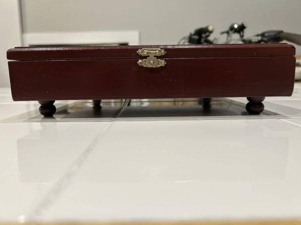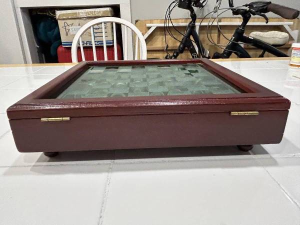 The entire burgundy coloured wooden casing assembly is 10.25" square and is supported on 4 legs and has a lidded glass playing board on top