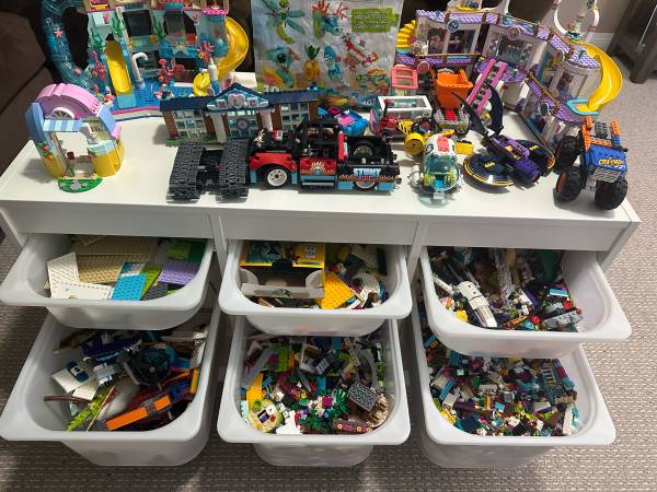 EUC lot of 42 Lego sets and lots of extra pieces. Includes the books for all 42 sets, trofast 6 bin table to store and build on and a travel container to store and build on. Many Lego friends and...