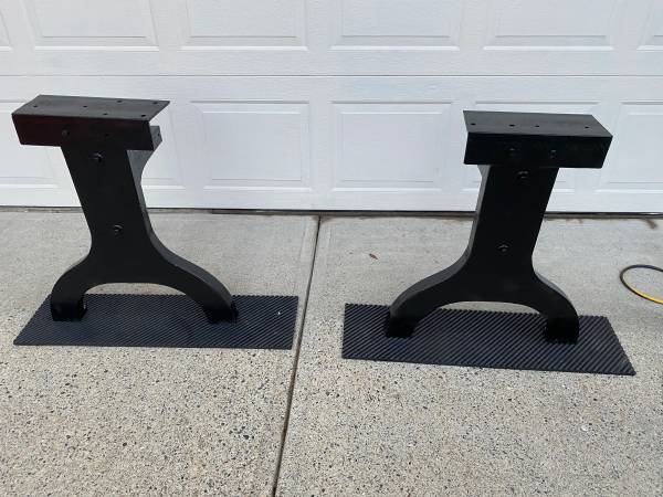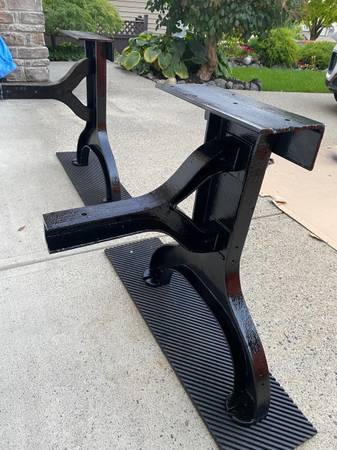 A pair of antique cast iron legs. They have steel on top and the stretcher is also steel. These are very heavy and would make an excellent base for a machine that requires a solid base such as a...