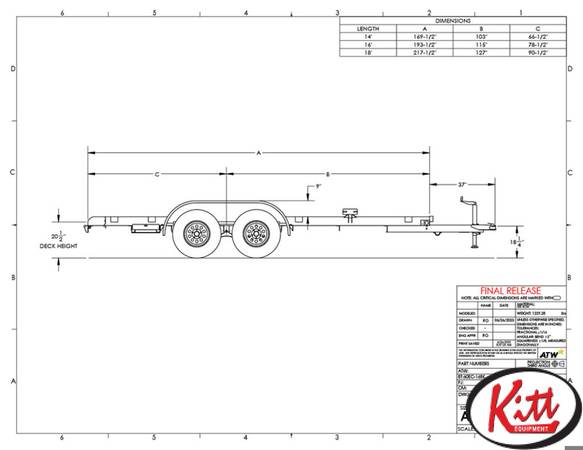 PHOTOS SHOW AN OPTIONAL SPARE TIRE, NOT INCLUDED ---------------------------------- Stake Pockets Along Sides EZ Lube Hubs Dexter Brand Axles Nev-R-Adjust Electric Brakes Cambered Axles Protected Wiring Removable Sand Foot on Jack Complete Break-A-Way System w/Charger Removable Fenders--PHOTOS SHOW OPTIONAL SPARE TIRE, NOT INCLUDED.Kitt Equipment 41511 Yale Rd Chilliwack, BC V2R 4J3 Ask for: Sales Primary Phone: show contact info A27FBAFAEA464DBBB650D168074EE06C 31857169 12103684