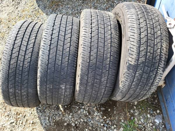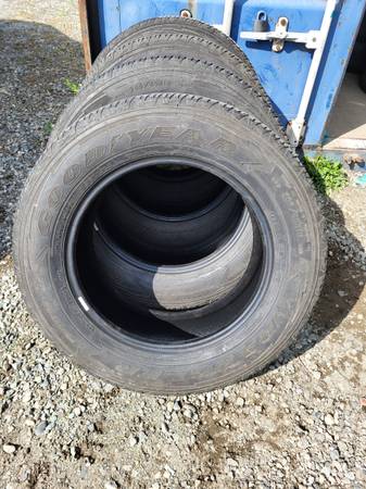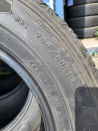 Set of 4 - Goodyear Wrangler Fortitude HT 265/60R18 M+S Tread: 65% (7/32") (Full tread depth if new would be 11/32") * One tire has 2 patches Pick up location: Mission